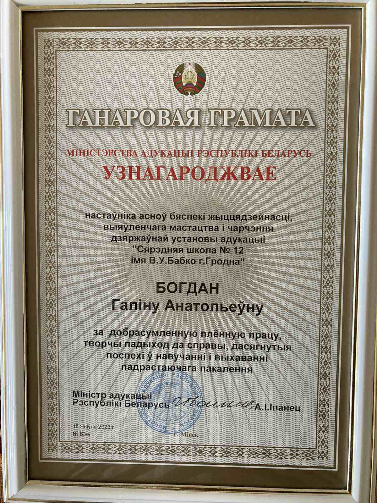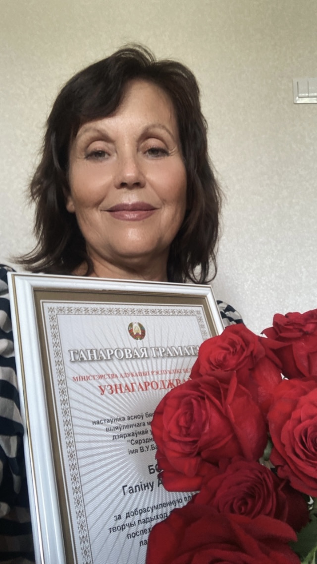 На августовской педагогической конференции в г.Гродно Галину Анатольевну наградили Почетной грамотой Министерства образования Республики Беларусь.