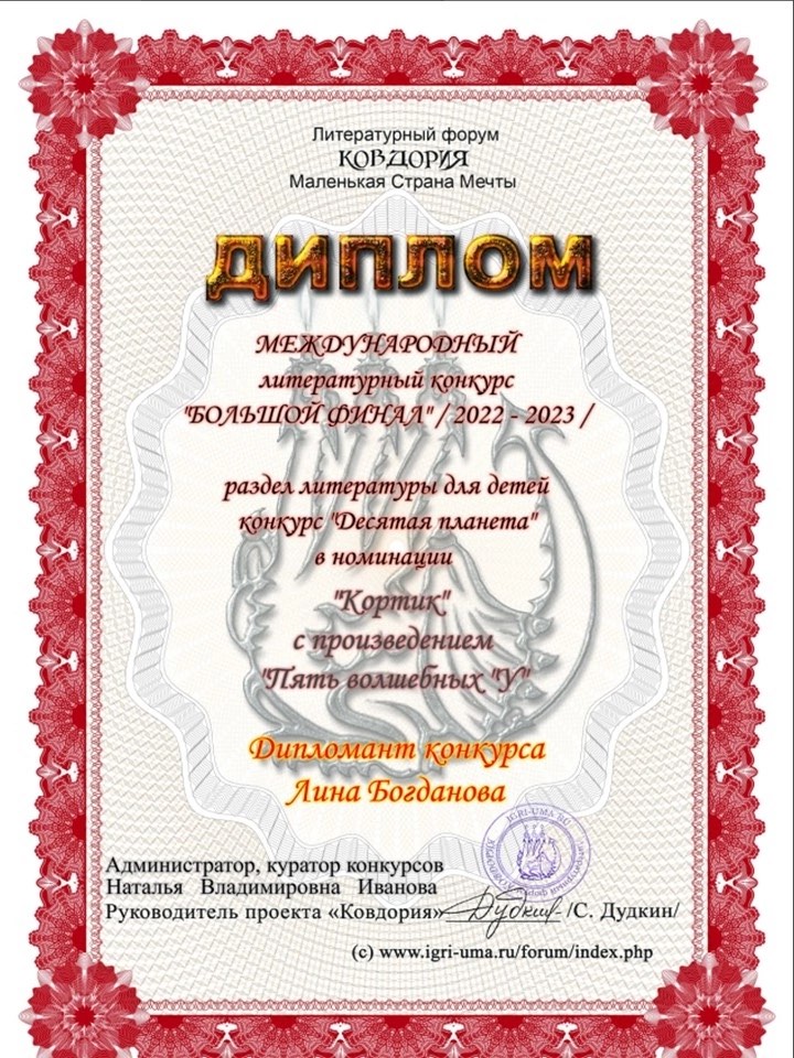 Рассказ Лины Богдановой «Пять волшебных «У» из сборника «Праздники бывают разные», вышедшего в издательстве «Народная асвета», отмечен дипломом Международного литературного конкурса «Большой финал», раздел литературы для детей, конкурс «Десятая планета», номинация «Кортик».