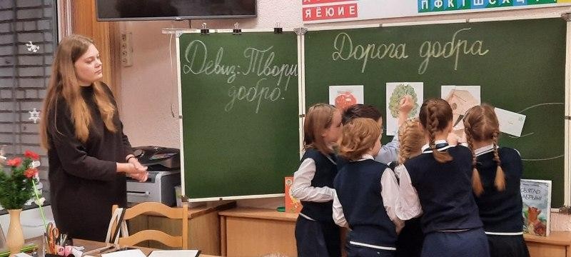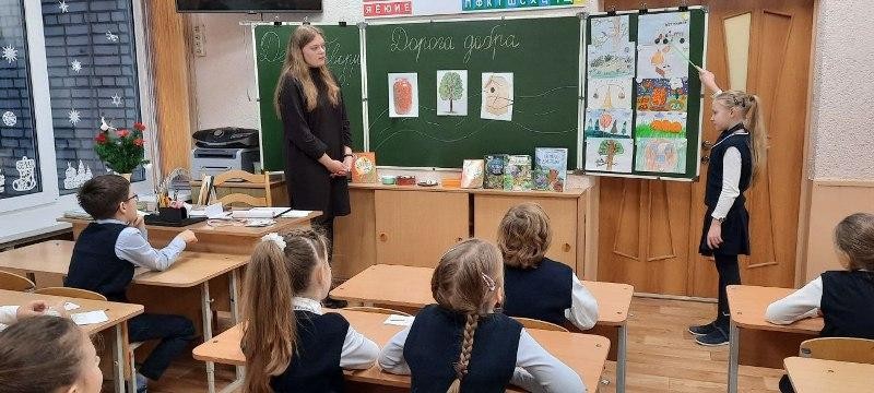 14 декабря 2023 г. в ГУО «Средняя школа № 159 г.Минска имени А.Ф.Данукалова» студентка 3-го курса факультета начального образования Белорусского государственного педагогического университета имени Максима Танка Елизавета Тиханович провела с учащимися 3 класса урок внеклассного чтения под названием «Дорога добра».
